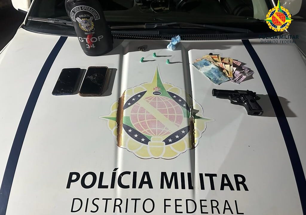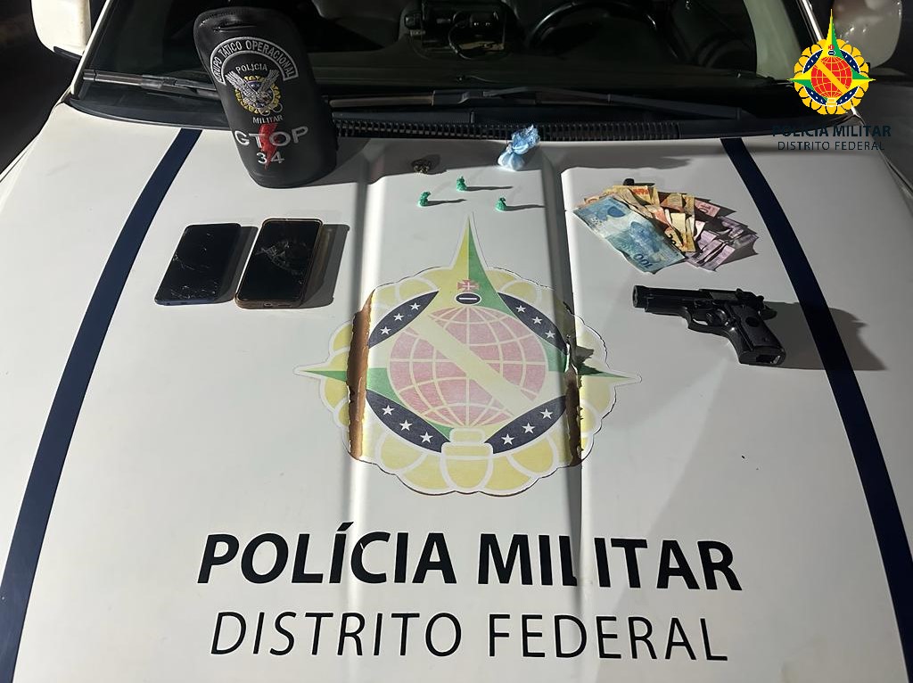 Durante a abordagem, foi encontrado um simulacro e de arma de fogo, porções de entorpecentes, dinheiro e dois smartphones. O detido foi encaminhado à delegacia para registro da ocorrência.