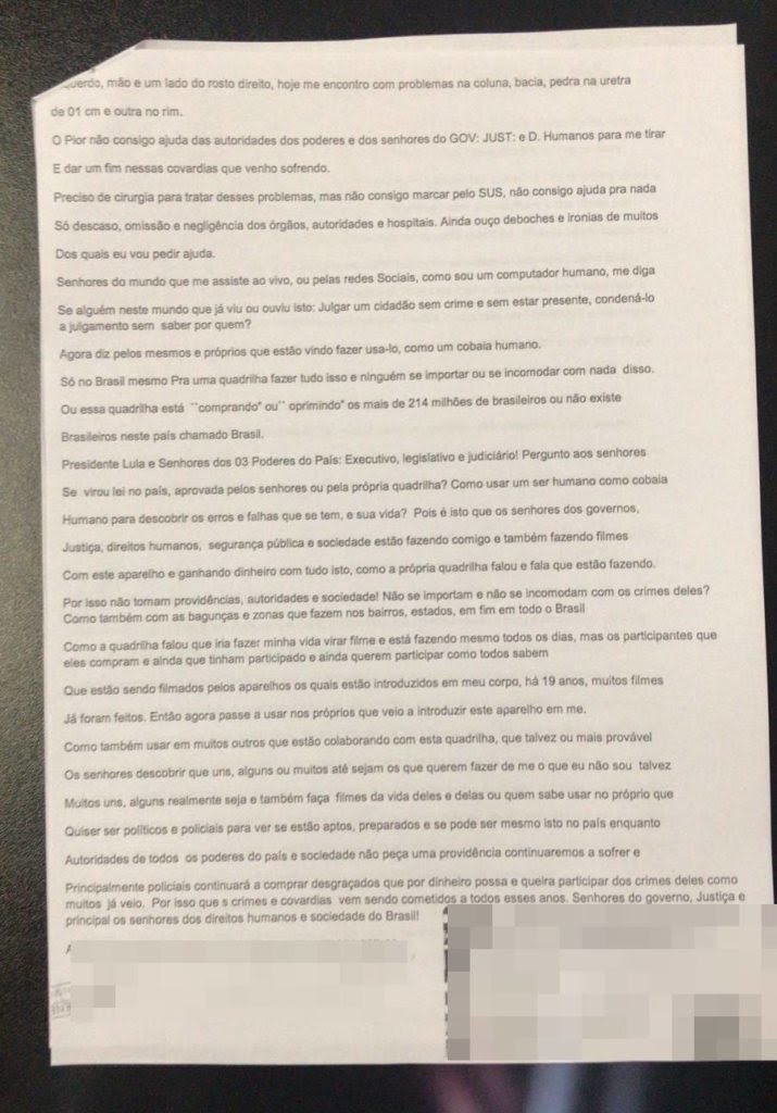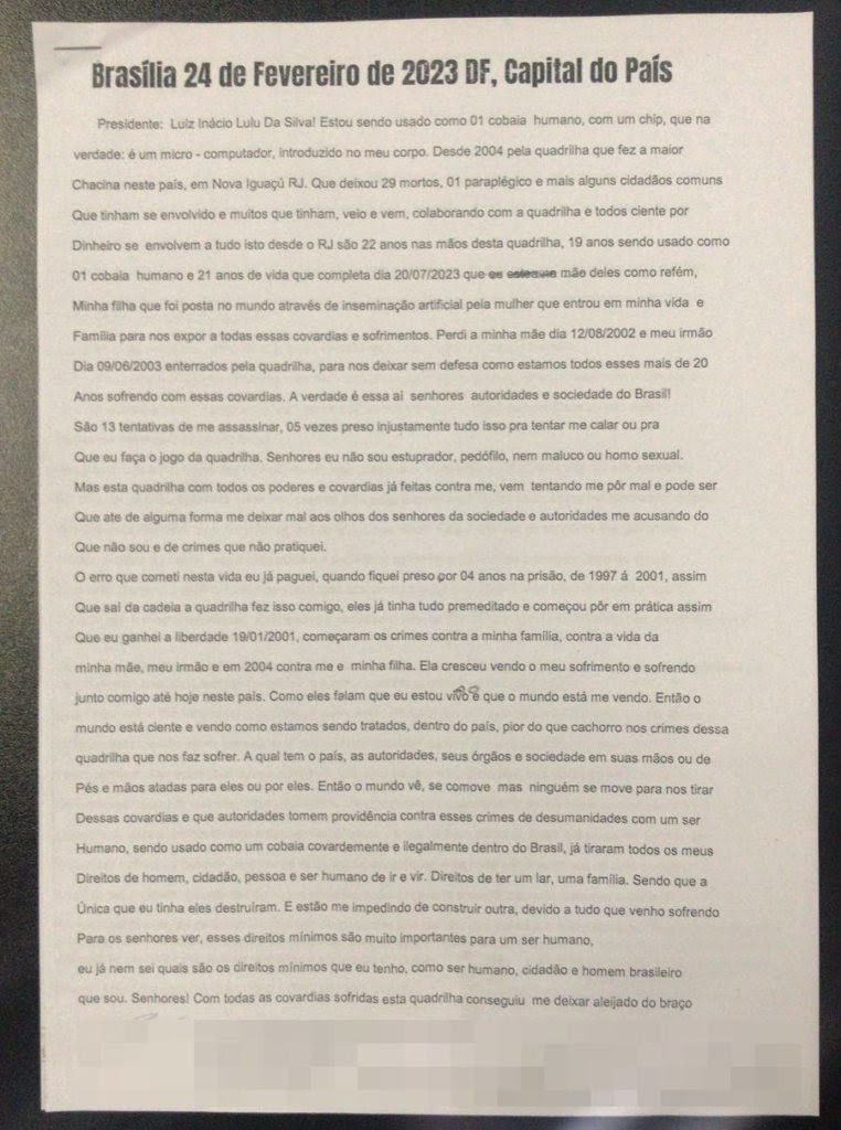 “Presidente Luiz Inácio Lula da Silva, estou sendo usado como cobaia humana com um chip, que, na verdade, é um microcomputador introduzido no meu corpo desde 2004 pela quadrilha que fez a maior chacina neste país, em Nova Iguaçu (RJ), que deixou 29 mortos, um paraplégico e mais alguns cidadãos comuns que tinham se envolvido”, inicia o relato.