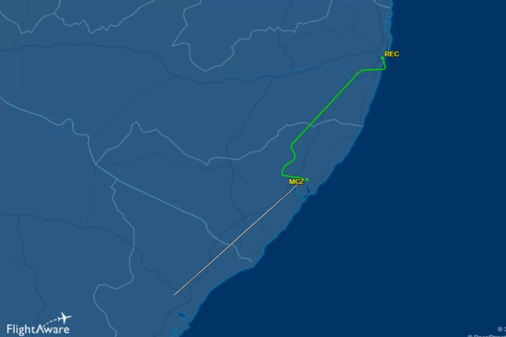 A plataforma FlightAware indica a mudança de rota e uma diminuição na altitude no momento em que a aeronave sobrevoava o estado de Alagoas. Logo depois, ela pousa na capital do estado.