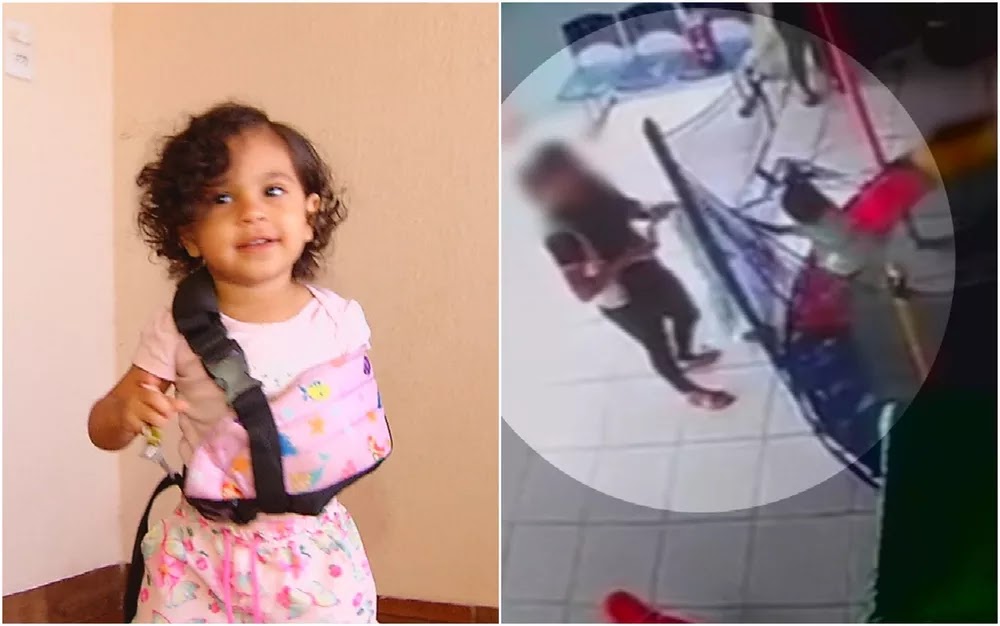 Uma bebê de 1 ano e 5 meses quebrou a clavícula após cair enquanto brincava em um pula-pula de uma escola em Rio Verde, no sudoeste de Goiás. Câmeras de segurança mostram quando a pequena Maria Júlia cai. Em seguida, uma funcionária a levanta e entra em uma sala com ela.