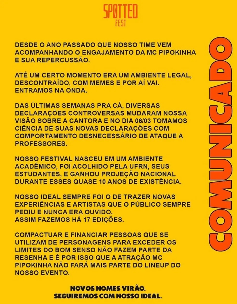 O Spotted Festival anunciou nesta quinta-feira (9) que a artista MC Pipokinha não vai mais se apresentar no evento, que acontece no dia 5 de agosto em Natal.