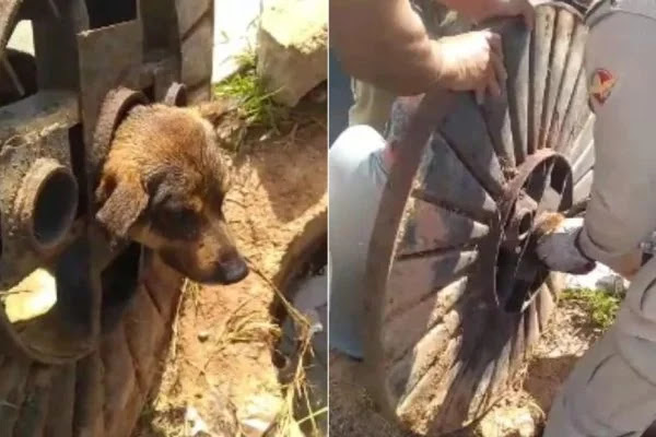 O caso aconteceu no bairro Reserva Ville. A corporação foi acionada para o resgate por moradores do local e, ao chegar, encontrou o pet preso. Como a tampa do bueiro era de aço, não era possível cortá-la.