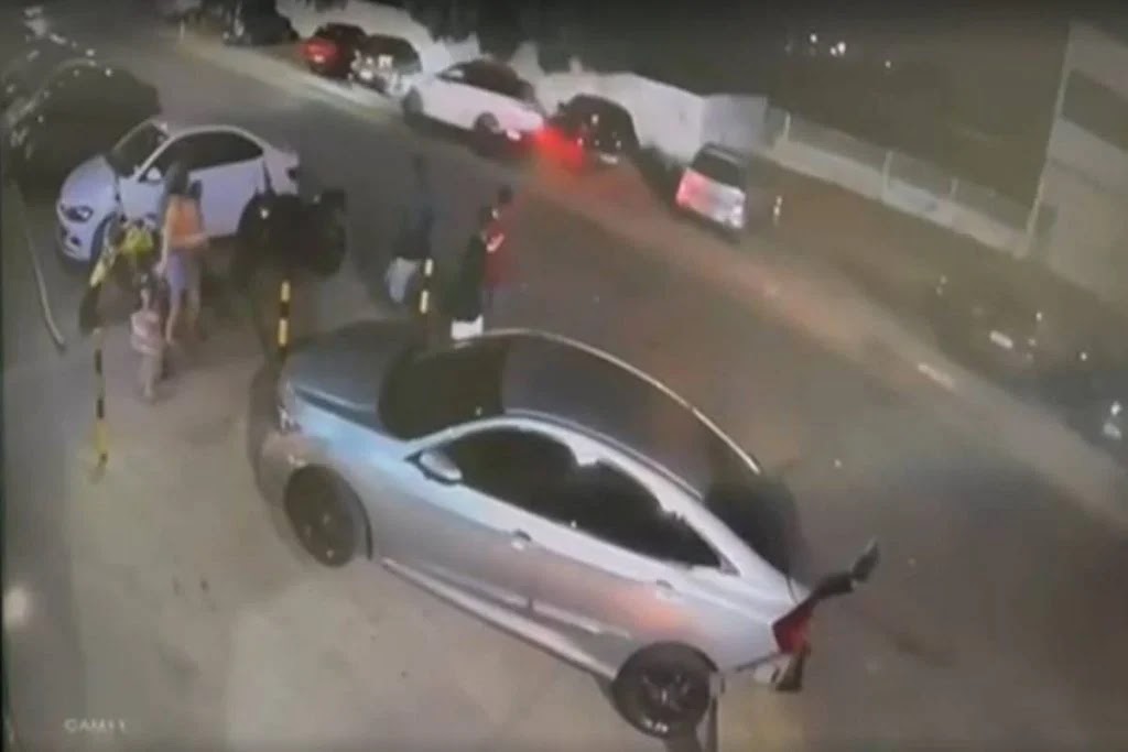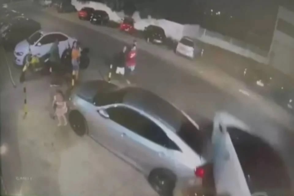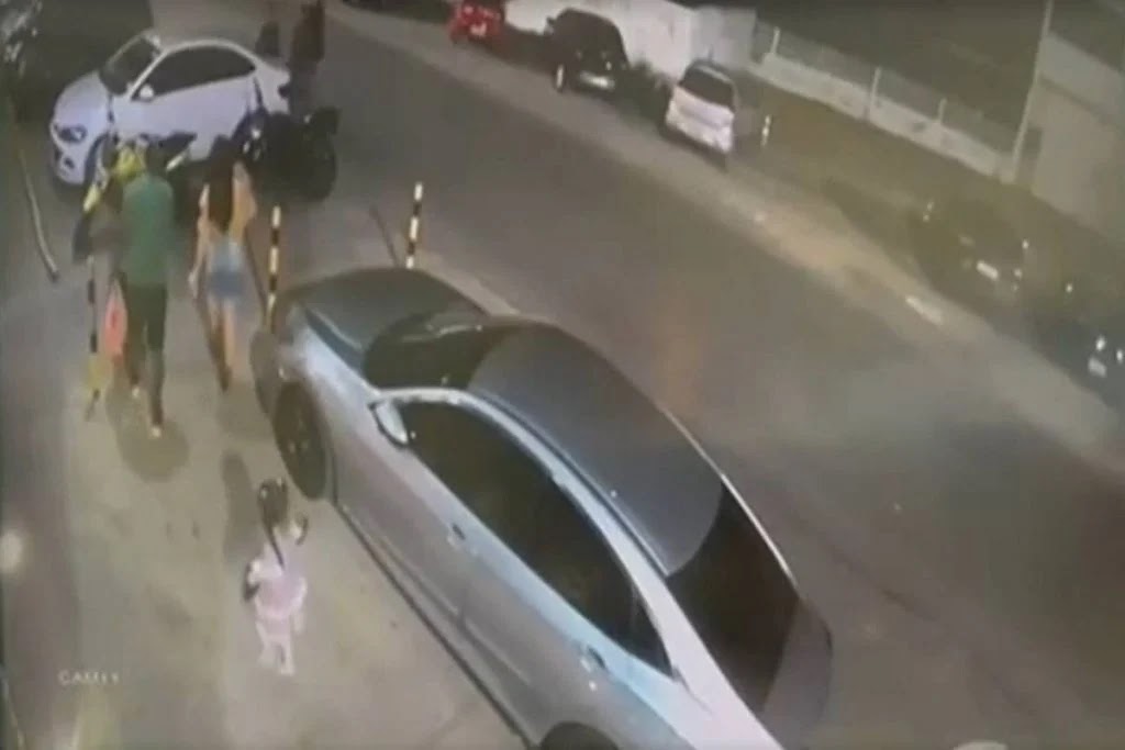 Uma família andava na calçada com a criança logo atrás. Segundos depois, o carro aparece em alta velocidade e bate no veículo que estava estacionado no local, o projetando para frente e ficando bem próximo de atingir a menina.