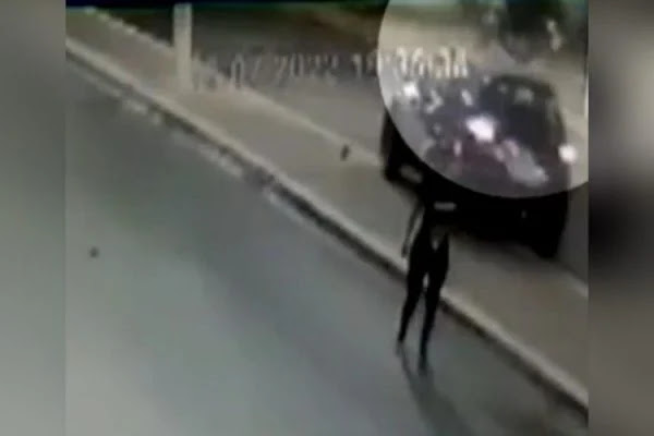 As imagens mostram ainda a queda de um motociclista que vinha na mesma direção do carro, ao frear diante do atropelamento. A ocorrência foi na noite da última sexta-feira (8/7).