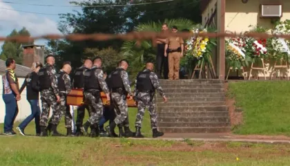 BrasilCorpo de PM baleado em tentativa de mega-assalto é veladoHomenagens aconteceram no mesmo horário que a morte cerebral do policial foi declarada, às 10h30, de sábado (23). Foto: Divonei Ravanello Júnior/RPC Guarapuava O…