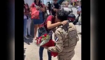 BrasilPolicial fardado faz pedido de namoro a adolescente em frente a colégioNo vídeo, o homem aparece, fardado, em um colégio do ensino fundamental e faz um pedido de compromisso a uma adolescente, que usa uniforme…
