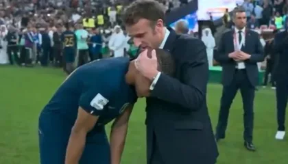 EsportesPresidente da França consola Mbappé após derrota para ArgentinaApós a França perder o título da Copa do Mundo de 2022 para a Argentina, presidente francês foi ao campo consolar o craque Kylian…