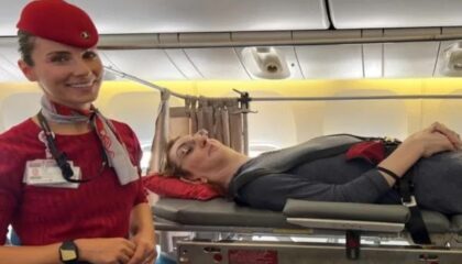 InternacionalMulher mais alta do mundo compartilha foto do 1º voo nas redes sociaisPara que trajeto entre Turquia e EUA pudesse ser realizado pela mulher mais alta do mundo, seis fileiras de assentos foram removidos Foto: Reprodução/Redes…