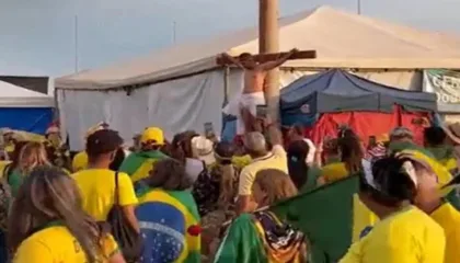 DFVídeo: bolsonaristas encenam crucificação de Jesus no QG de BrasíliaVídeo mostra um circulo de oração de bolsonaristas, enquanto um jovem, com uma coroa de espinhos, é “pregado” no poste do QG de Brasília…
