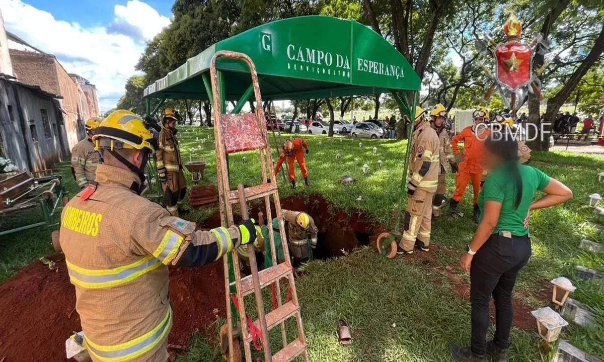 O Corpo de Bombeiros do Distrito Federal (CBMDF) foi acionado para socorrer as vítimas que caíram dentro da cova na tarde de sábado (20/1).