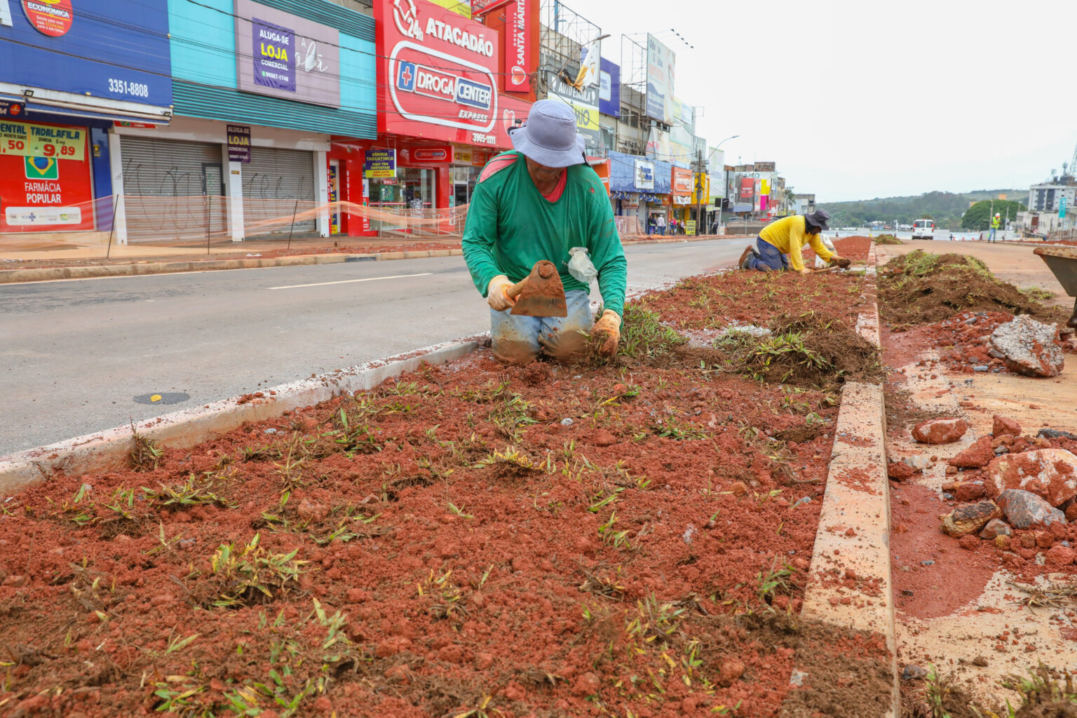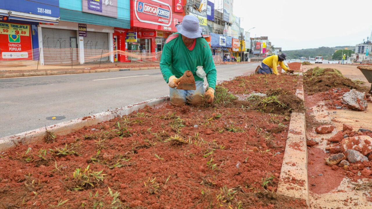 Fase 1 do piso superior, trecho que fica entre a EPTG e a Avenida Comercial, terá 600 m² de canteiro revestidos com placas da espécie batatais; trabalho foi iniciado nesta segunda (5)