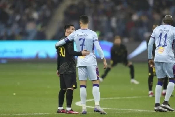 Depois de defender a equipe mista formada por jogadores do Al-Nassr, seu time na Arábia Saudita, e do Al-Hilal, em amistoso contra o Paris Saint-Germain, Cristiano Ronaldo publicou algumas fotos da partida em seu perfil do Instagram. Uma das imagens mostra o craque português cumprimentando Lionel Messi em campo durante a partida, que foi disputada em Riad e terminou com vitória por 5 x 4 para o time francês.