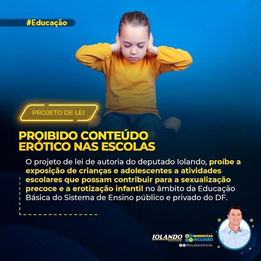 EM DEFESA DA CRIANÇA E DO ADOLESCENTE . O deputado Apresentou, na Câmara Legislativa, um Projeto de Lei que determina a proibição de atividades escolares que possam contribuir para a sexualização precoce e a erotização infantil no âmbito da Educação Básica do Sistema de Ensino público e privado do Distrito Federal.