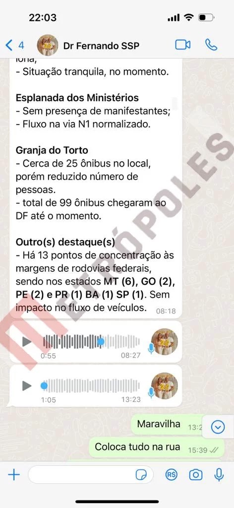 Em um print que revela conversa entre Fernando e Ibaneis, no início desta tarde, o secretário em exercício detalha cada um dos pontos onde havia concentração de ônibus que levavam manifestante para o ato. Após o áudio de Fernando tranquilizando Ibaneis, o governador responde: “Maravilha. Coloca tudo na rua”, em referência ao efetivo policial que atuaria na ocasião. Veja: