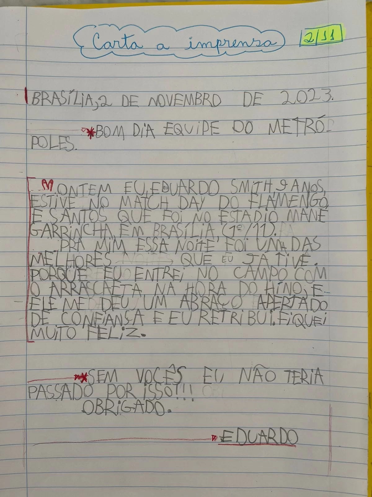 A situação marcou tanto a vida do torcedor-mirim, que ele enviou uma carta ao Metrópoles para agradecer pela oportunidade.