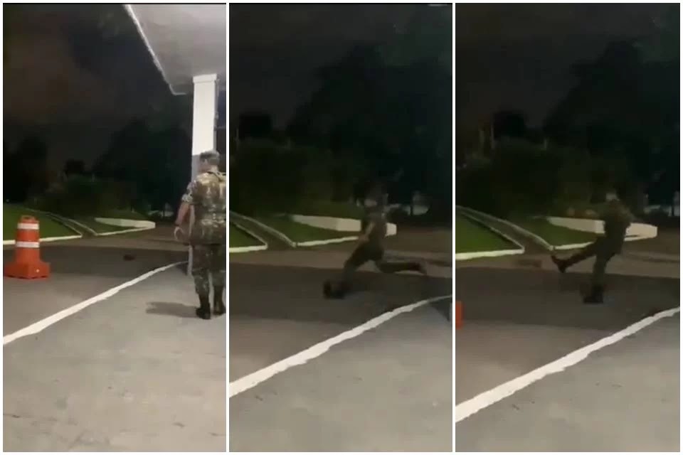 Imagens que circulam nas redes sociais mostram o momento em que o militar do Exército chuta um animal não identificado