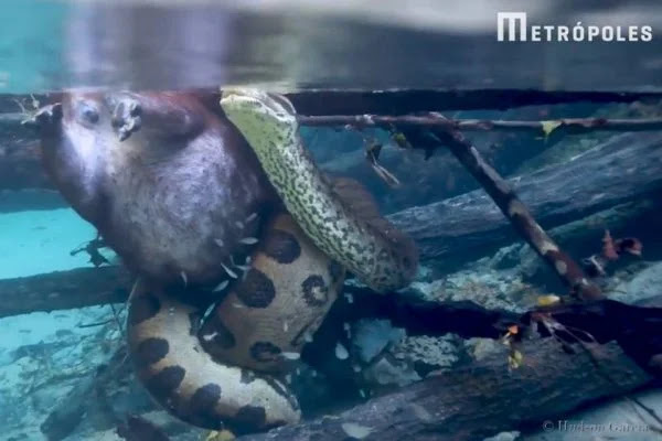 A sucuri-verde, da espécie Eunectes murinus, media 6 metros e prendeu o mamífero por cerca de 1h30
