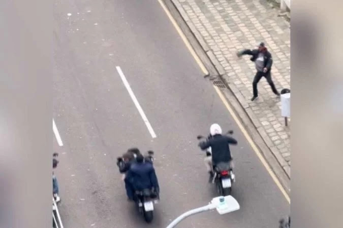 O homem se aproxima, vestido com uma blusa de moletom e com um capuz na cabeça. Ele coloca a mão no bolso e simula jogar um objeto. O vídeo não capta nada sendo jogado, mas não é possível ter certeza pela qualidade do registro ser baixa.