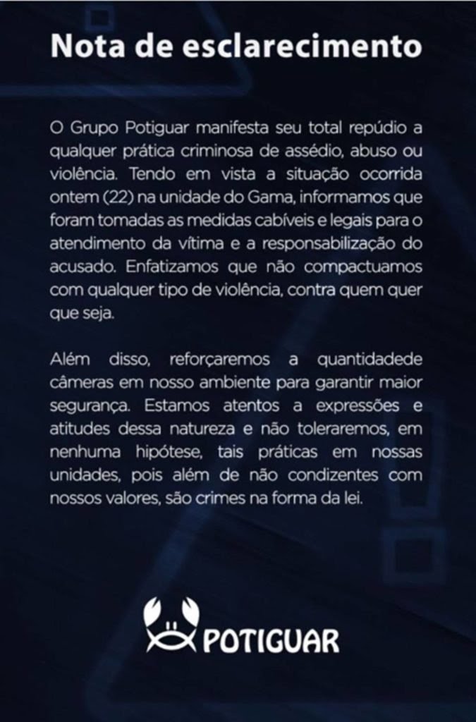 Procurados pela reportagem, os responsáveis pelo bar se posicionaram sobre a tentativa de estupro dentro do estabelecimento. Leia abaixo a nota do bar Potiguar: