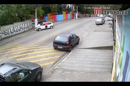 Uma câmera de segurança registrou o Fiat Uno branco saindo do controle e batendo em um poste. As imagens mostram que em seguida o homem aparece correndo atira novamente e saí apressado.