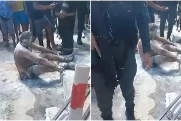 Pessoas que estavam próximas usaram água, cimento e areia para tentar apagar as chamas no corpo do suspeito.