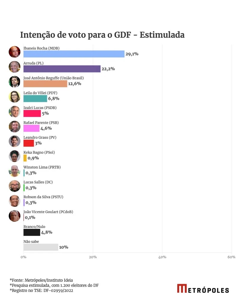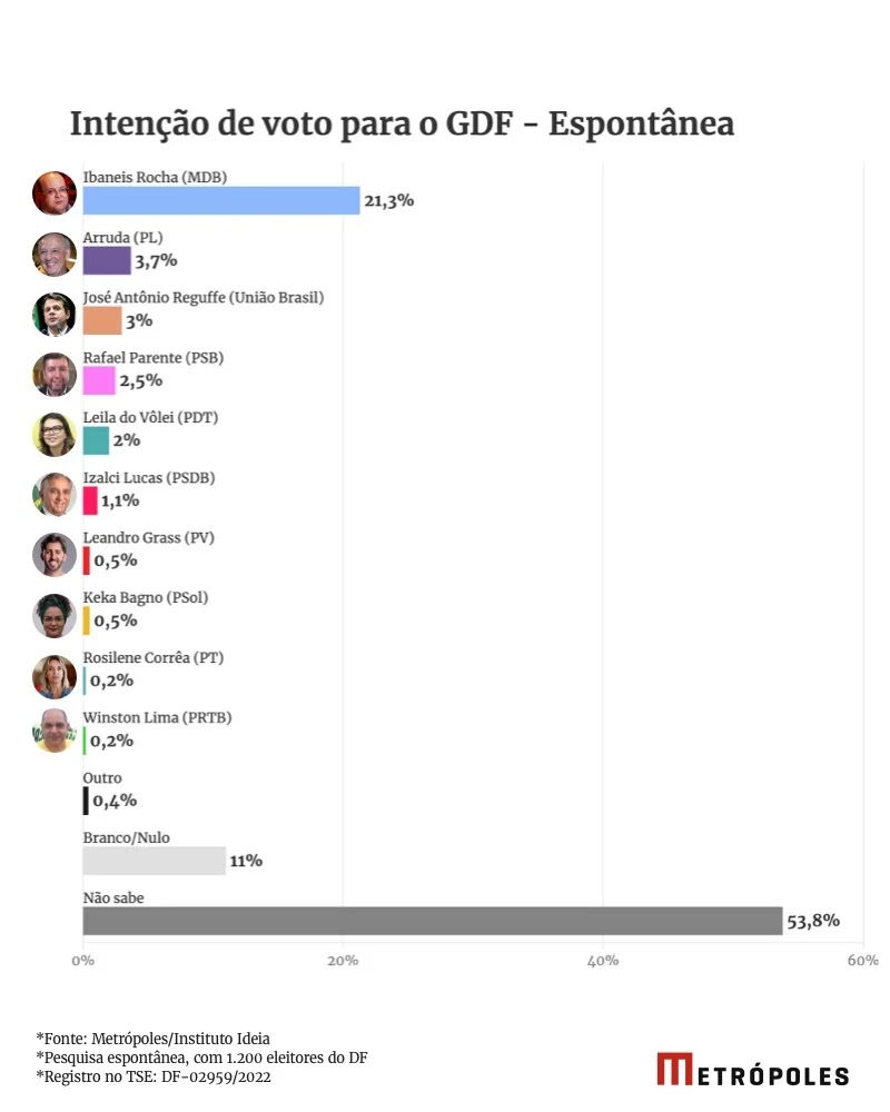 O senador José Antônio Reguffe (União Brasil) foi escolhido por 12,6% do eleitorado brasiliense para o GDF. Atrás dele, estão a senadora pedetista Leila do Vôlei (6,8%), o senador tucano Izalci Lucas (5,0%) e o ex-secretário de Educação pessebista Rafael Parente (4,6%). A pesquisa mostra que o deputado distrital Leandro Grass (PV) tem 3,0% das intenções de voto.