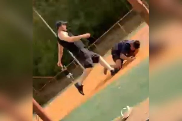 Gravação mostra pessoa adulta desferindo diversos chutes em menor de idade caído no chão de quadra esportiva