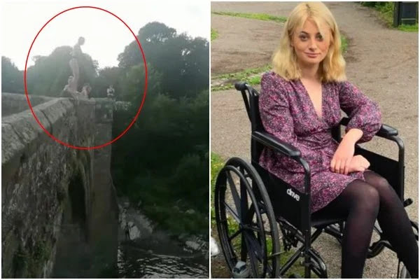 Uma jovem de 22 anos tem feito fisioterapia para conseguir andar novamente. Libby Sinden pulou de uma ponte de 15 metros em direção ao rio Lune, na Inglaterra, durante um passeio com os amigos em julho do ano passado. Desde então, ela luta para recuperar os movimentos das pernas.