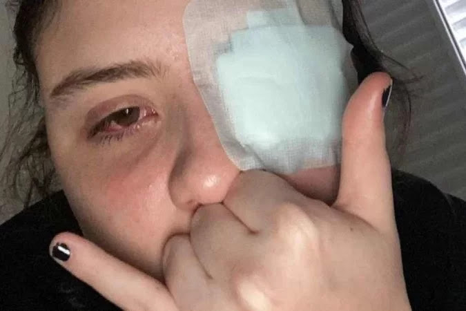 Como a dor e a ardência continuaram, o namorado a levou a uma farmácia, onde lavou os olhos com soro fisiológico.
