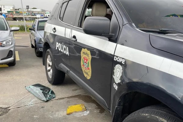 Vidro de carro de grupamento de elite da Polícia Civil foi quebrado quando veículo estava estacionado em posto de combustíveis