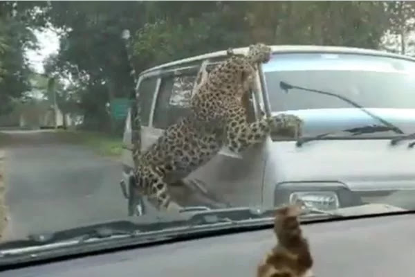 Em uma imagem que circula nas redes sociais, o leopardo aparece pulando um muro e atacando um carro. O animal chega a arrancar a estrutura de uma das janela do veículo e depois foge.