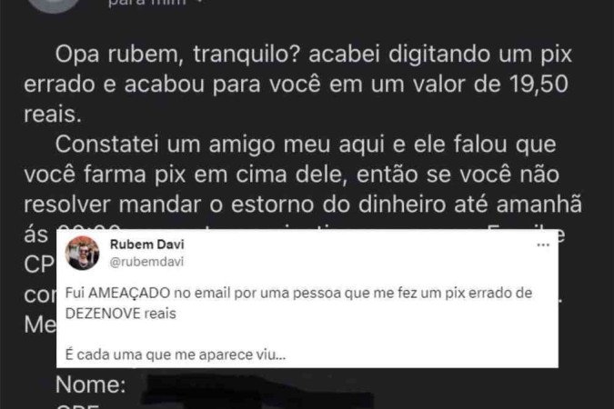 Ao pegar o celular, no domingo (1°), o médico Rubem Davi de Paiva Cunha, de 33 anos, achou engraçado ao ver um e-mail com a cobrança de um PIX, enviado por engano, no valor de R$ 19,50.
