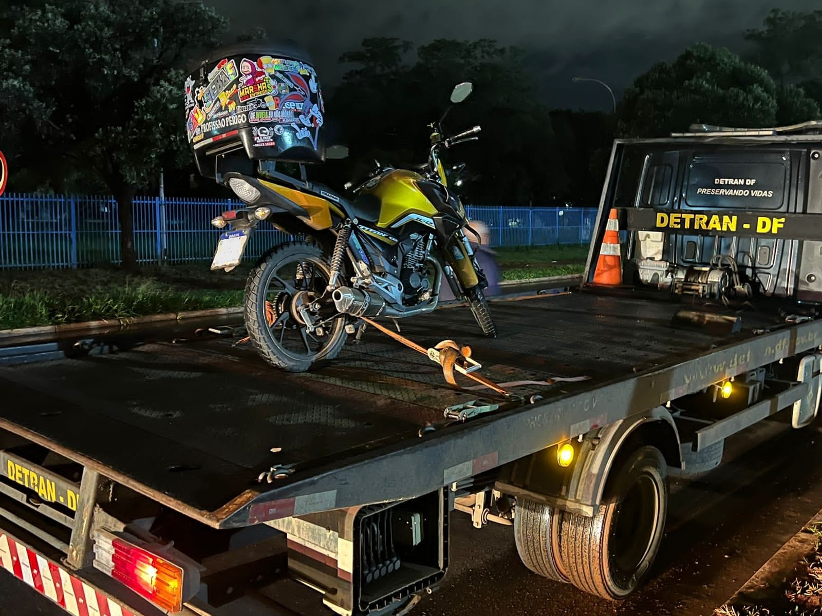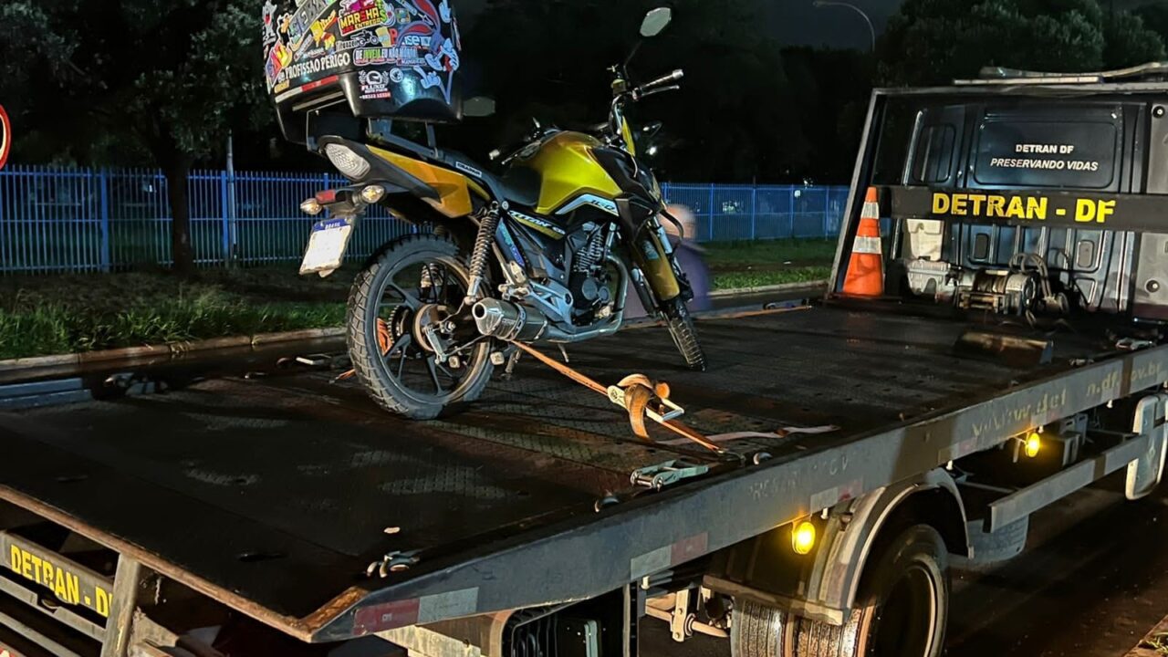 A motocicleta – uma Honda CG 160 Titan, cor amarela, ano 2022 – é registrada em Águas Lindas (GO) e foi levada no guincho até o Depósito de Veículos Apreendidos da Asa Norte.