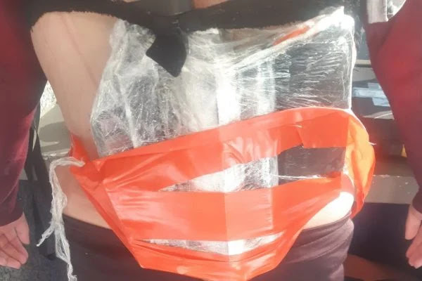 Durante a fiscalização de um veículo de passeio, agentes da Polícia Rodoviária Federal (PRF) estranharam o volume nas costas da mulher. O fuzil estava desmontado, embalado e preso ao corpo com uma fita, escondido pelo casaco.