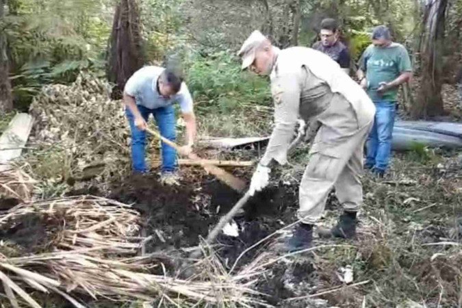 O delegado detalha que, nesta quinta-feira (6/7), policiais civis da unidade localizaram a cova com o corpo de Francisco. “Vimos marcas de machado na cabeça, facadas, uma espingarda enterrada. Os vizinhos escutaram tiros na região, mas não vimos marcar de tiro no corpo dele”, diz. No local, policiais civis encontraram ao menos dez munições de uma espingarda.