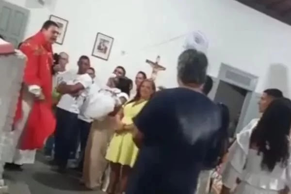 O batismo de uma criança em Propriá terminou em discussão nessa quinta-feira (4/5). O padre que conduzia a cerimônia se desentendeu com o padrinho e pediu que ele se retirasse. O momento foi registrado em vídeo por pessoas que acompanhavam a celebração religiosa.