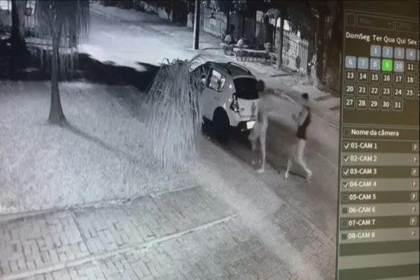Pelas imagens gravadas por câmeras de monitoramento do bairro, é possível ver quando o personal chega próximo ao carro. Ele bate no vidro com violência, depois agride o morador de rua do lado de fora.
