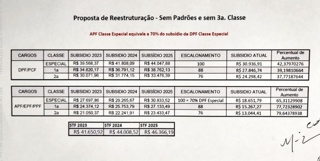 Já para os agentes da base da carreira, o reajuste proposto é de 80%, de R$ 13 mil para R$ 23,4 mil em 2025. O aumento seria implementado gradualmente, com reajustes sucessivos em 2023, 2024 e 2025.