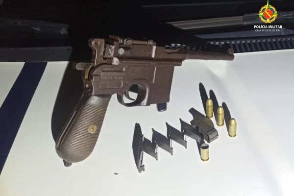 Uma pistola Mauser C96 calibre 9mm foi apreendida, por volta das 20h deste domingo (15/5), por policiais militares do Grupo Tático Operacional do 24º Batalhão (Gtop 44) no Varjão. Três homens foram detidos na ação.