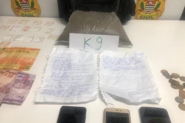 Durante a vistoria no local onde essas duas pessoas estavam, os PMs encontraram um isopor repleto de drogas. Além da K9, foram encontradas 2.700 porções fracionadas de maconha, 35 seringas de THC, 2.868 pinos e 541 papelotes de cocaína, 1.727 porções de crack, 30 porções de skank e rádios comunicadores.