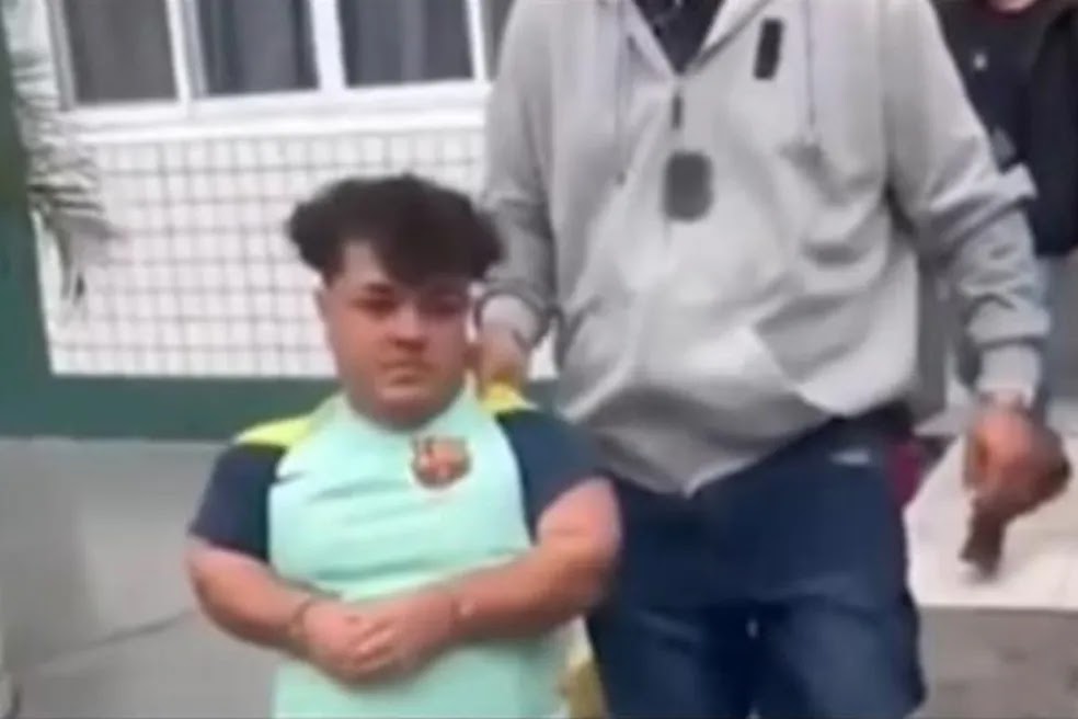 Imagens obtidas pelo g1 mostram o momento da prisão do homem. Os policiais conduzem o suspeito até a viatura e, aos risos, dizem que seria necessária uma escada para Rodrigo subir no automóvel. Em seguida, um dos agentes pega o suspeito no colo e o coloca dentro do porta-malas.
