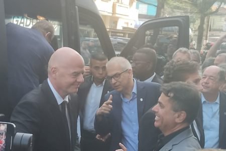 Infantino chegou acompanhado do presidente da CBF, Ednaldo Rodrigues, e do presidente da Conmebol, Alejandro Dominguez.