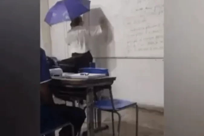 Vídeo que mostra uma professora usando um guarda-chuva para se proteger de goteira na sala de aula viralizou na última semana. O caso ocorreu na Escola Gaspar Viana, em Nova Marabá, no estado do Pará.