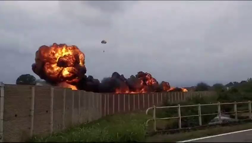 O piloto, que sobreviveu, pôde ser visto ejetando-se com o paraquedas aberto momentos antes de o jato atingir o solo.