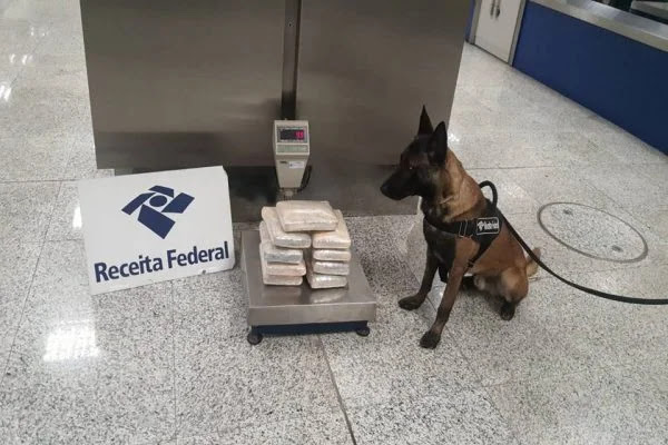 A apreensão foi realizada em operação de rotina da Receita Federal no Aeroporto Internacional de Brasília, que contou com o uso de equipamento raio-x e apoio dos cães d farejadores Bruce e Rock na detecção da mala suspeita.