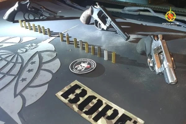 Os PMs apreenderam três armas de fogo e 5kg de maconha, que foram levados para a delegacia do Novo Gama. O carro usado pelos suspeitos seria roubado.
