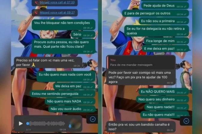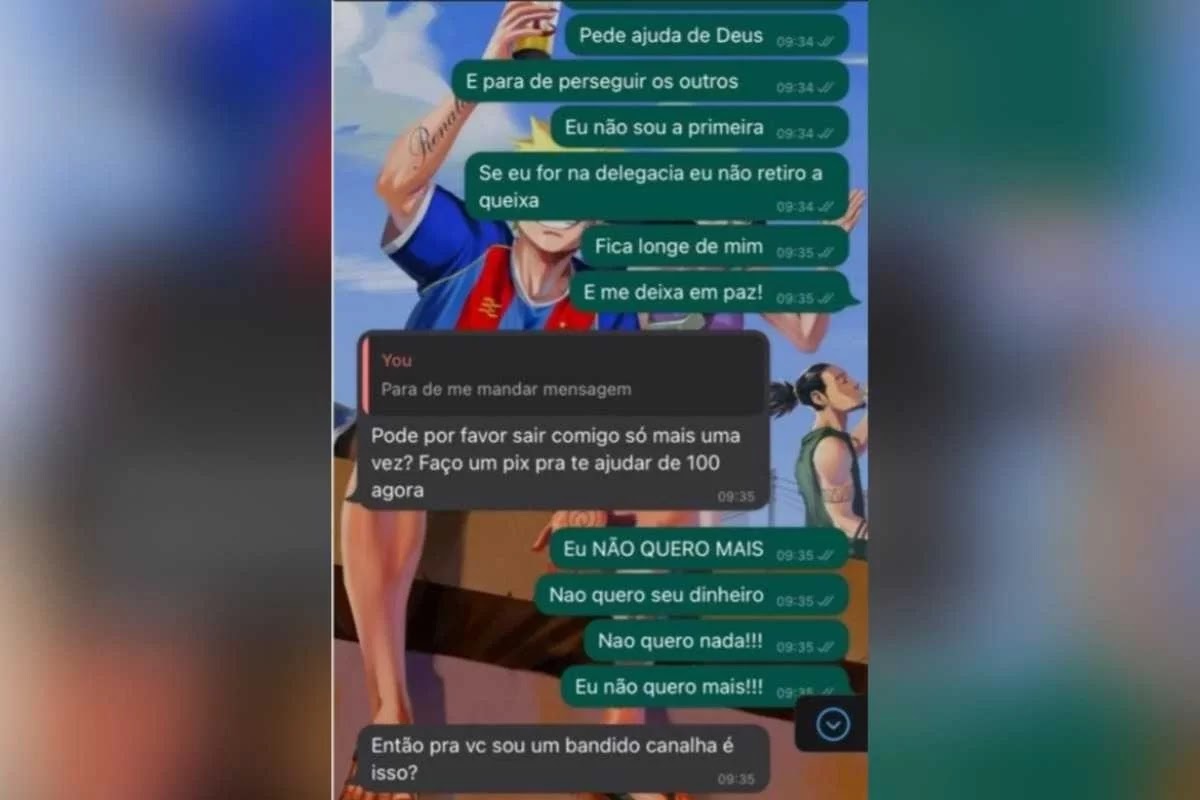 Nas mensagens, a estudante deixa claro não haver nada entre os dois e diz se sentir perseguida. Em resposta, o homem insiste: “Preciso só falar com você mais uma vez, por favor.” A jovem continua a pedir para o homem deixá-la em paz e ameaça registrar queixa na polícia. Inconformado, o servidor a pede para sair com ela mais uma vez. “Pode, por favor, sair comigo mais uma vez? Faço um Pix para te ajudar de R$ 100 agora”, insiste.