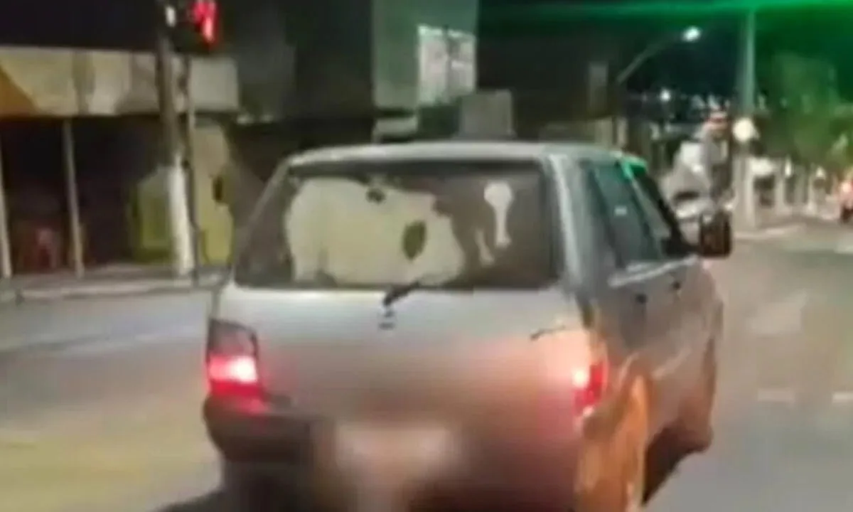 Uma cena inusitada foi registrada na cidade de Catalão, no sudoeste goiano. Um motociclista registrou um bezerro sendo transportado em pé no porta-malas de um carro, que levava outras quatro pessoas.