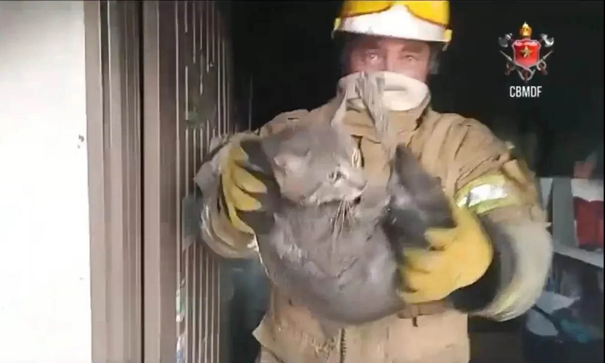 Gatos são resgatados por equipes da CBMDF durante incêndio que atingiu apartamento de edifício no bairro Jardim Roriz, em Planaltina (DF)