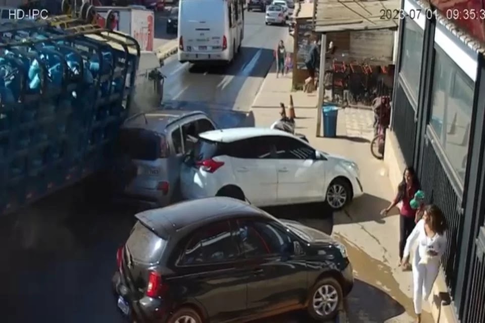 Imagens de câmeras de segurança dos comércios da região flagraram o momento que o caminhão entra desgovernado na contramão e atinge outros automóveis.